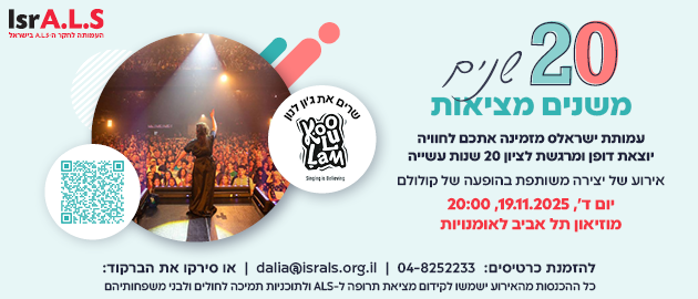בבלוג ישראלס תוכלו להתעדכן בחדשות ובמחקרים, חוויות, ימי עיון ומידע שימושי וחשוב בנושא ALS. כנסו >> אודות ישראלס
